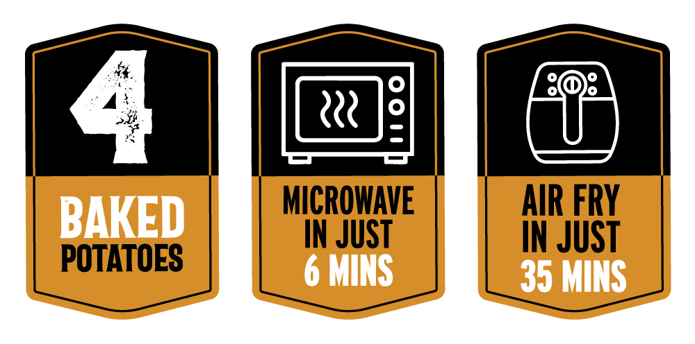 Real potatoes, ready in just 6 minutes. Crispy on the outside, fluffy on the inside, and perfect for loading up with your favourite toppings. Big on comfort, big on flavour, and ready when you are.
